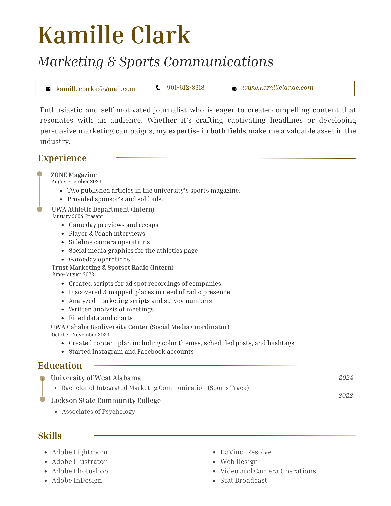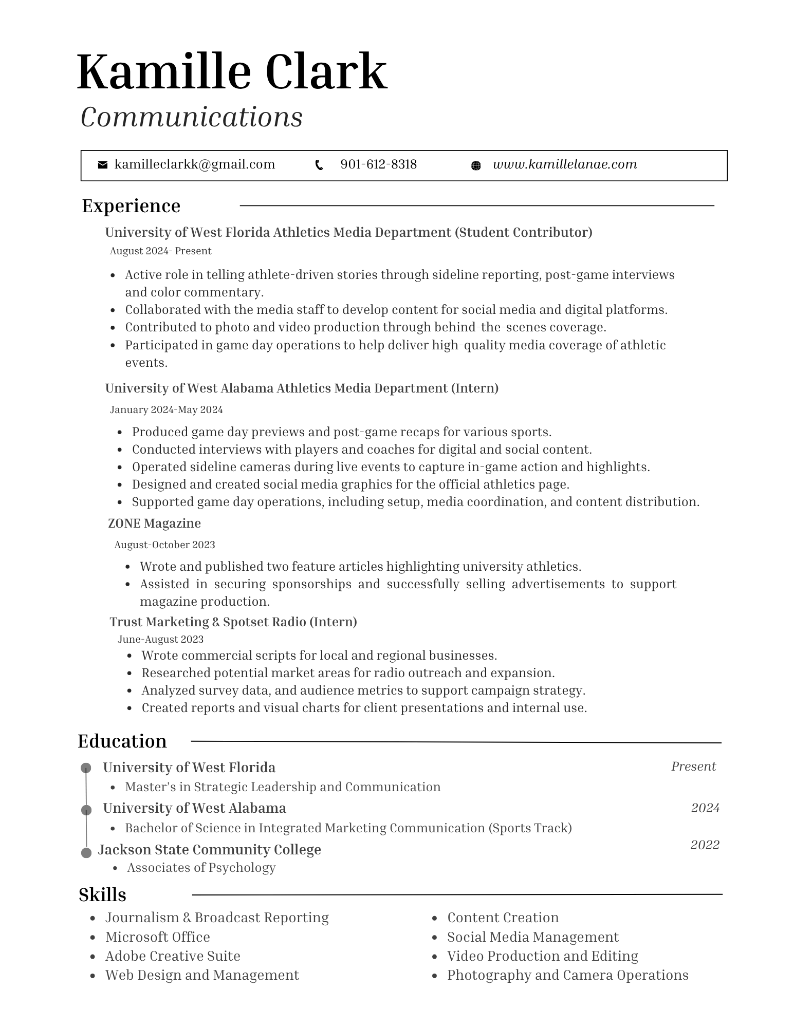 Being a former collegiate athlete has given me great experience in teamwork, time management, leadership, determination, and decision making, which are skills that have carried over not only to my personal life, but also my passion to have a successful career in sports reporting.